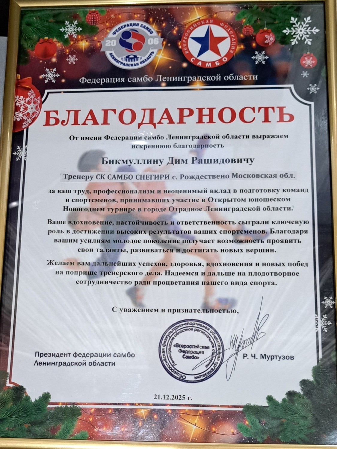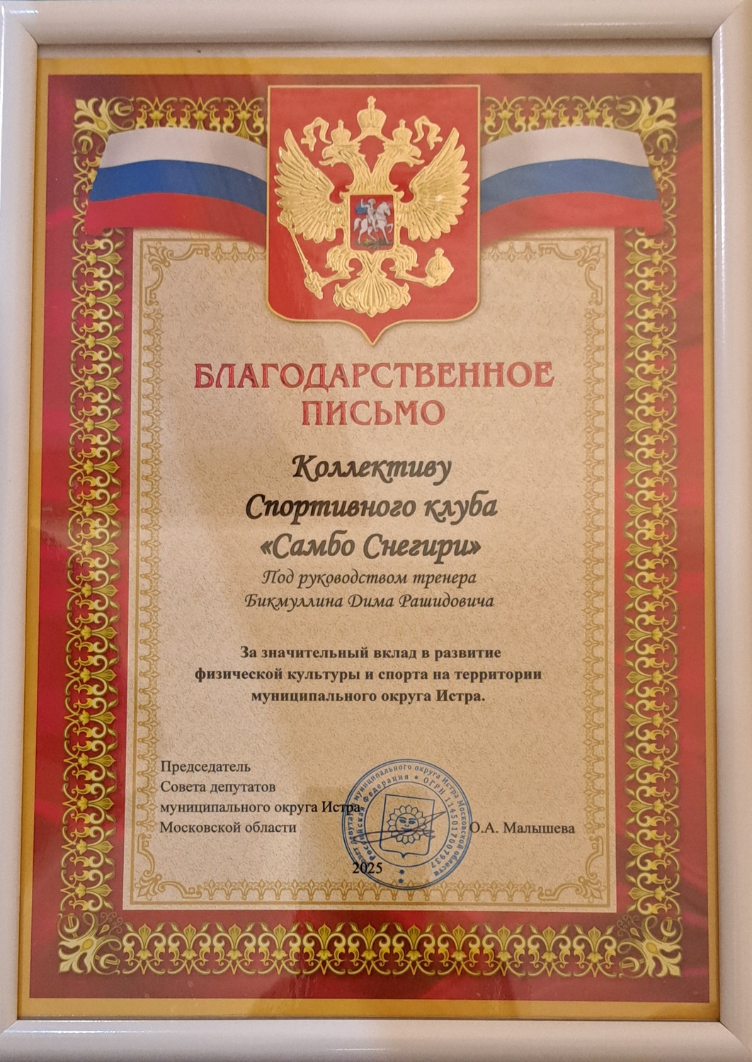 Благодарность коллективу Ск "Самбо Снегири" и тренеру Бикмуллину Д.Р. от Администрации м.о Истра за достигнутые результаты в спорте.