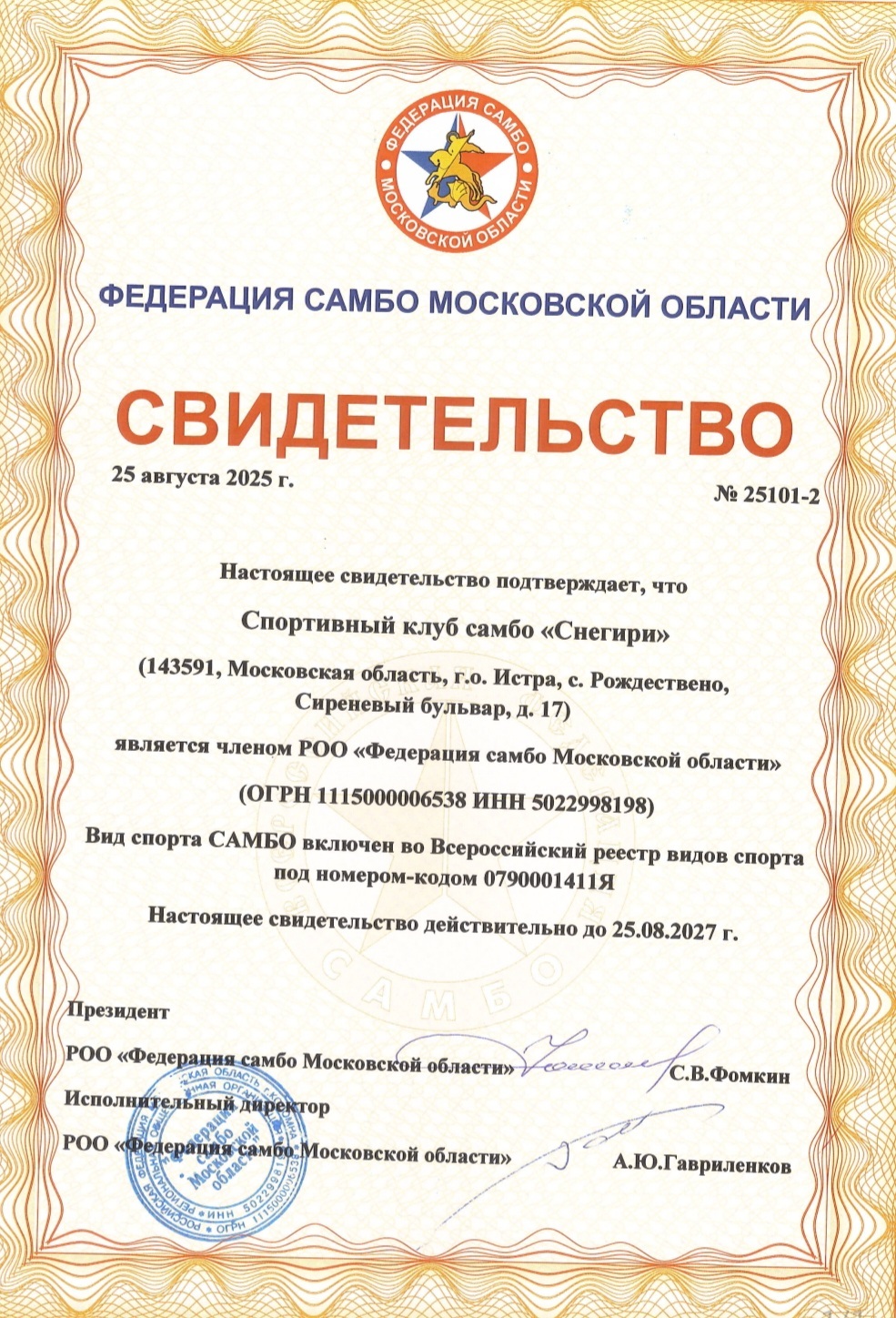 Наш клуб аккредитован и является членом РОО"Федерации Самбо Московской Области",что дает нам право официально вести деятельность тренировочного процесса , учавствовать в соревнованиях и.тд. А так же наш клуб является официальным представителем самбо в с.Рождествено.